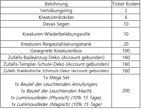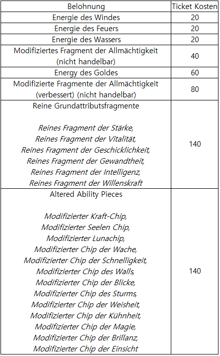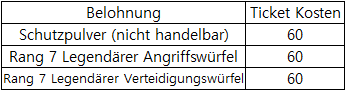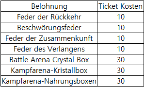 Diese Tabelle beinhaltet Belohnungen, die es gibt, wenn die anderen Angebote nicht verfügbar sind. Sie wird den ganzen Tag über in Abständen von insgesamt 13 Stunden und 30 Minuten gezeigt.