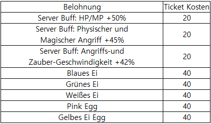 Buff abholen - Dadurch bekommt Ihr den Golden Week Buff. Ihr bekommt für zwei Stunden +30 auf die Grund-Stats bis auf Glück VIP Ticket: Geschenke eintauschen - Mit dieser Option ist es möglich, die Belohnungen, die von Beginn bis Ende feststehen, auszuwählen. VIP Coupons für Spezielle Angebote - Dies erlaubt Euch die Tickets für zusätzliche Belohnungen einzutauschen, diese ändern sich während des Tages zufällig! Es gibt eine ausführliche Liste, die aufzählt, was es gibt und für wie lange. Ist Euer Glück euch hold? - Der NPC entscheidet ob Ihr einen zusätzlichen Buff wert seid. Sobald er sich für den Tag entschieden hat, kann man seine Meinung nicht mehr ändern. Wenn Ihr es wert seid, bekommt Ihr +38 Dunkler Vorhang für eine Stunde. Wenn nicht...seid Ihr 2 Minuten lang gestunned!